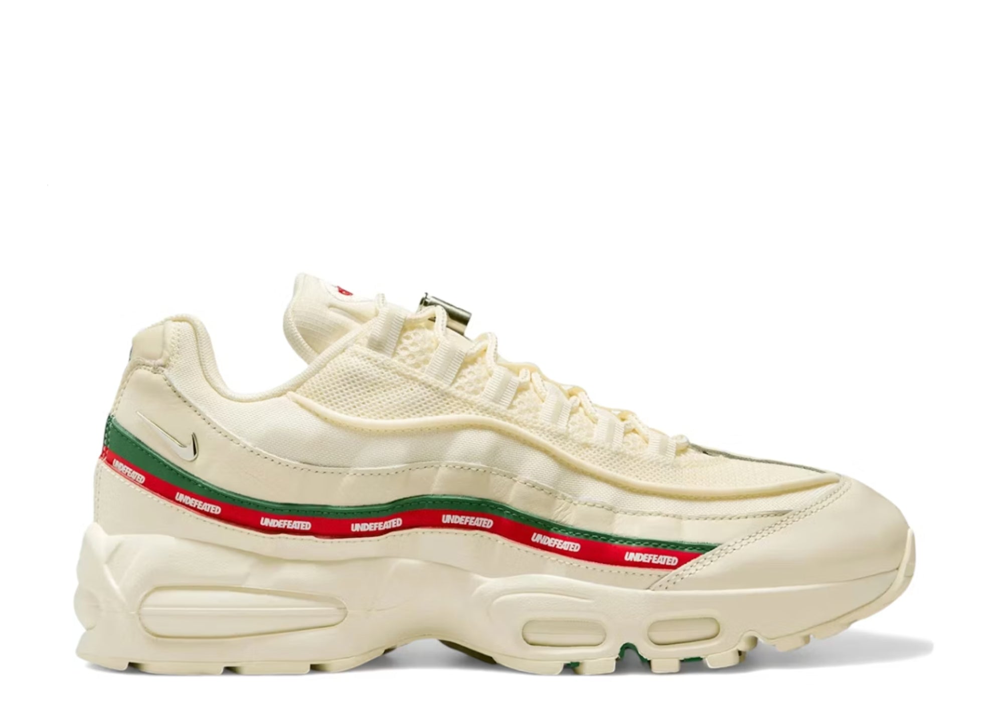 Cette Air Max 95 SP Undefeated Sail se distingue par sa bande centrale verte et rouge, arborant le branding Undefeated. La majorité de la tige est réalisée dans un blanc cassé fidèle à son nom, complétée par un logo Air Max rouge et vert sur la languette et un logo Nike Air vert au talon. Les détails métalliques argentés sur le Swoosh et le lace toggle ajoutent une touche premium, tandis que les unités Big Bubble  Air sont désormais opaques. Le logo Undefeated apparaît également sous la semelle.