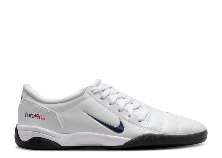 La Nike Total 90 3 SP PSG White Midnight Navy signe le retour d’une icône du football, dans une version exclusive aux couleurs du célèbre club parisien. Cette édition spéciale reprend la silhouette emblématique du début des années 2000, avec une tige blanche sublimée par des accents Midnight Navy, rappelant fièrement l'identité du Paris Saint-Germain.